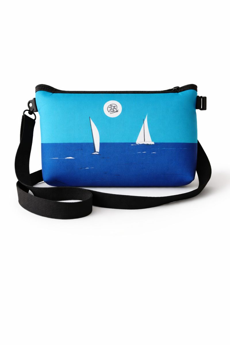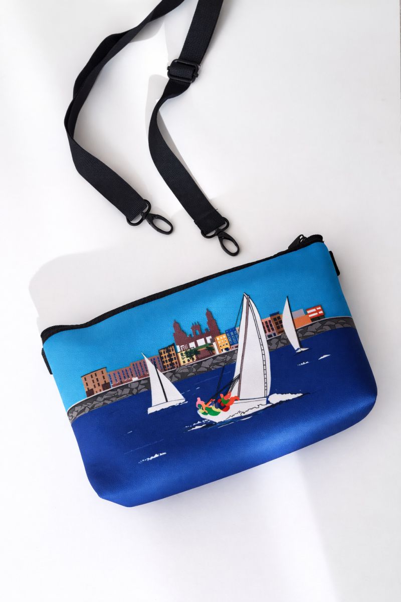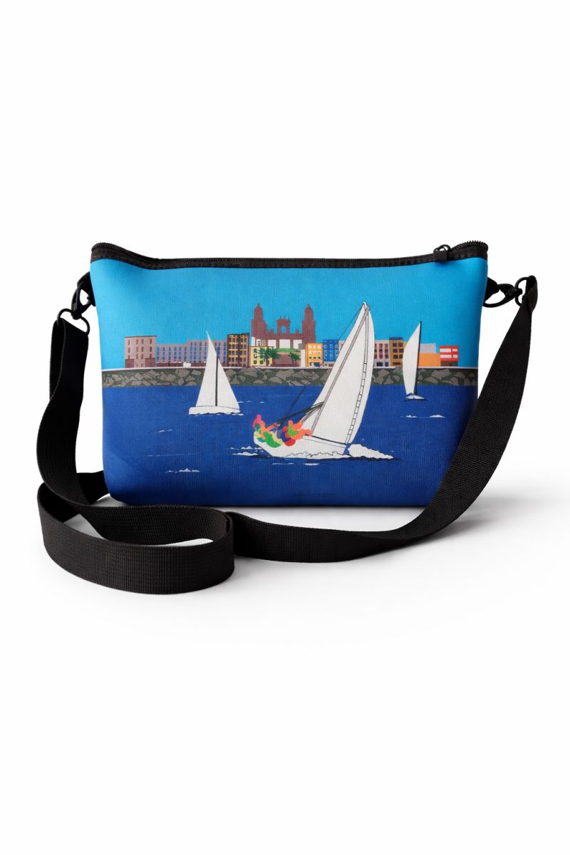 Bolso o neceser reversible inspirado en la vela latina canaria, con las embarcaciones navegando frente a Vegueta y la Catedral. Un diseño lleno de mar, tradición y esencia canaria.