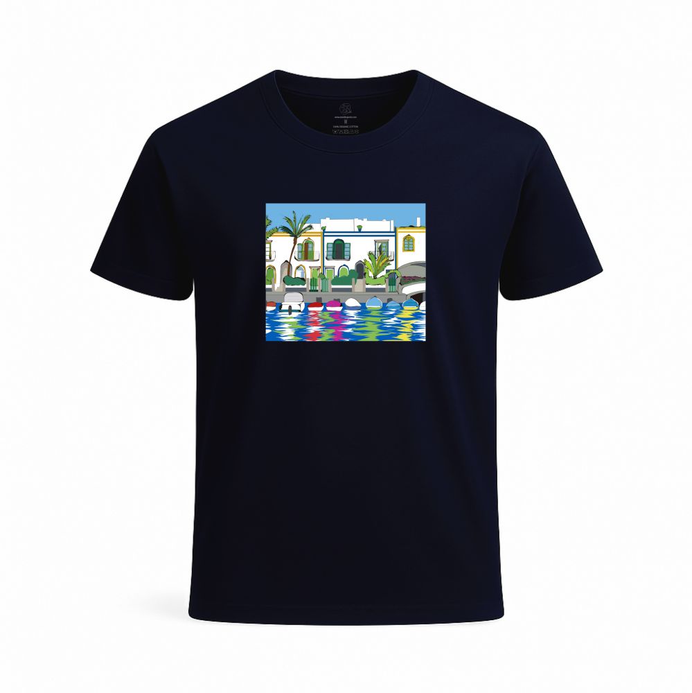 Camiseta unisex azul marina diseño «Mogán» algodón 100% orgánico.