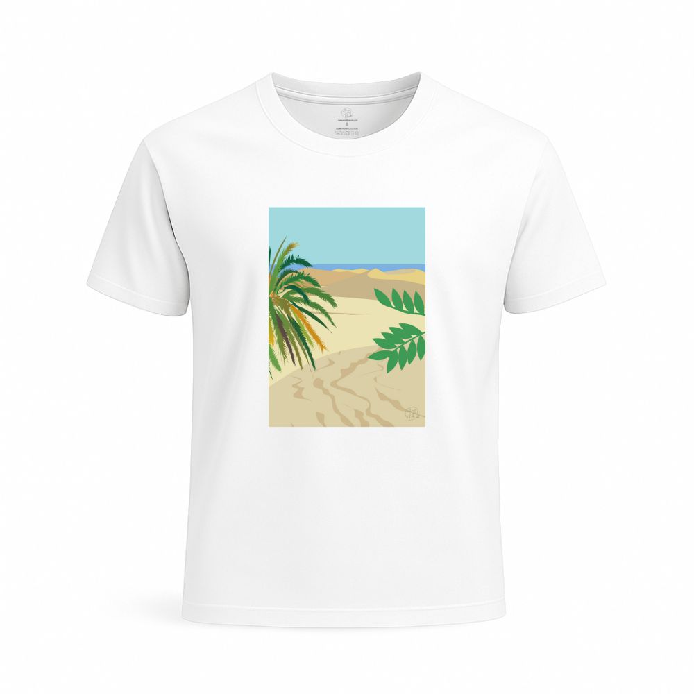 Camiseta unisex color blanco diseño «Dunas de Maspalomas» algodón 100% orgánico.
