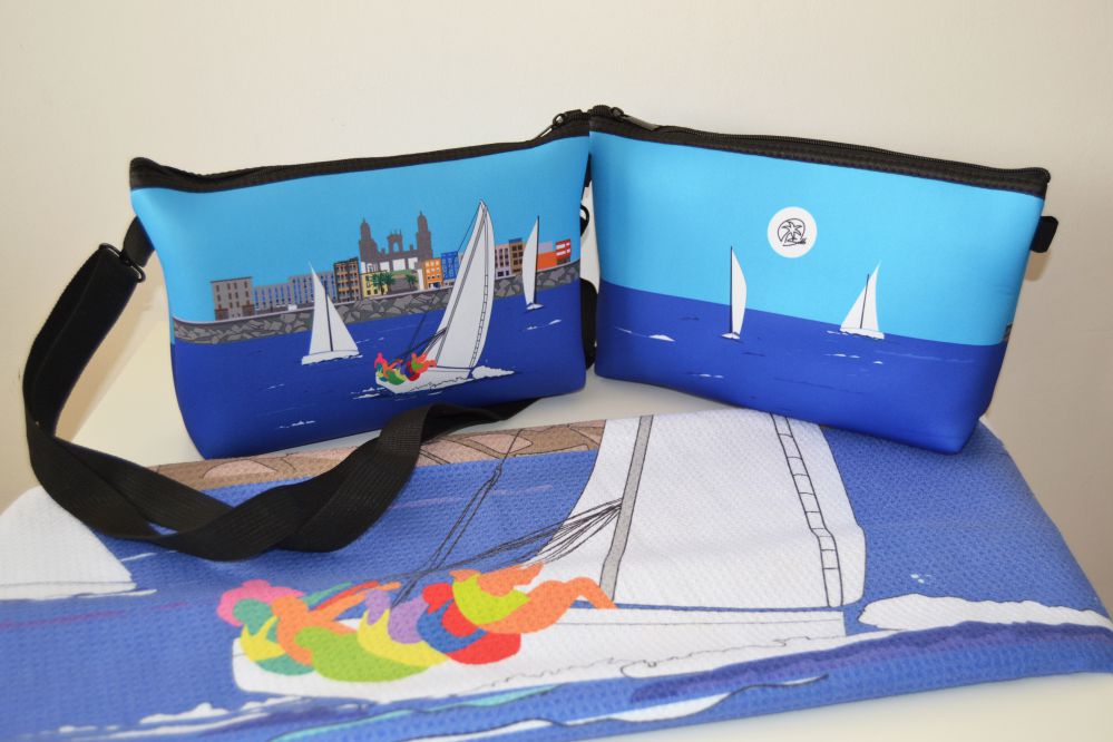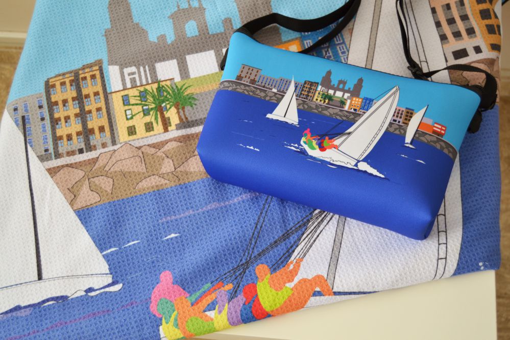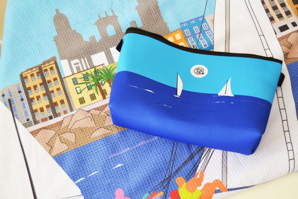 Pack compuesto por toalla de tejido waffle (gofre) reciclada y bolso neceser multifuncional de neopreno, con diseño exclusivo inspirado en el deporte náutico tradicional de la Vela Latina Canaria y el paisaje histórico de Vegueta, en Las Palmas de Gran Canaria.