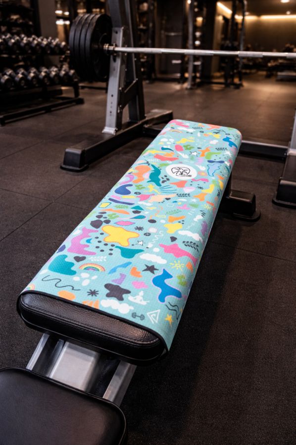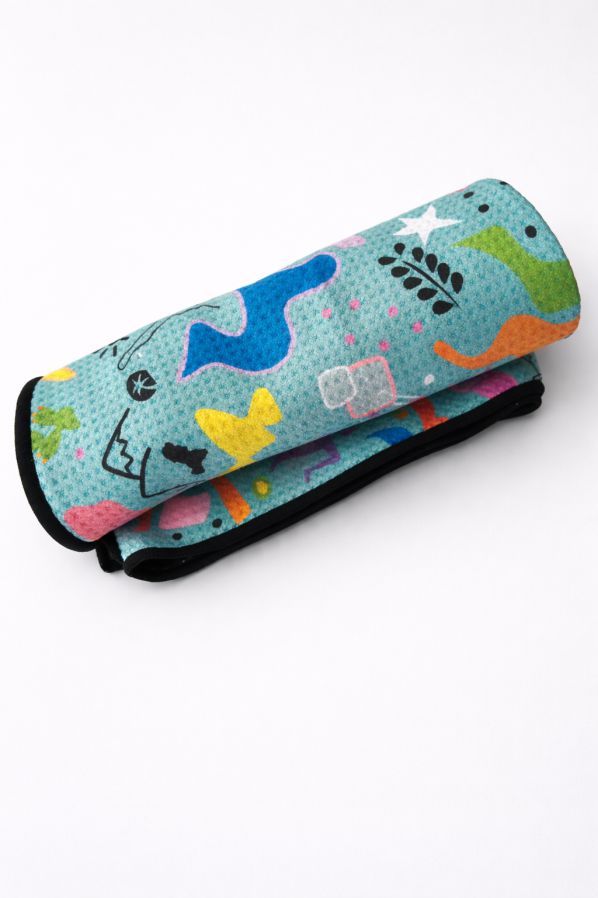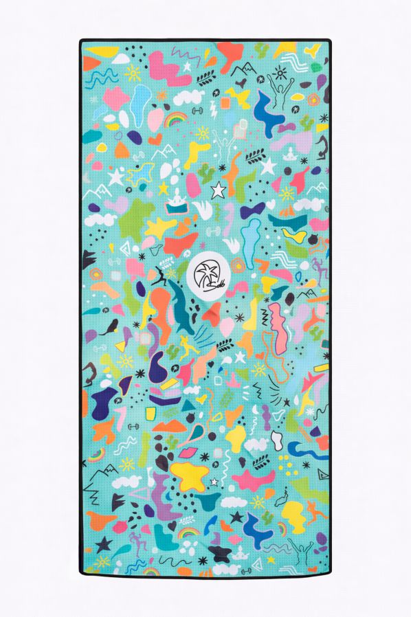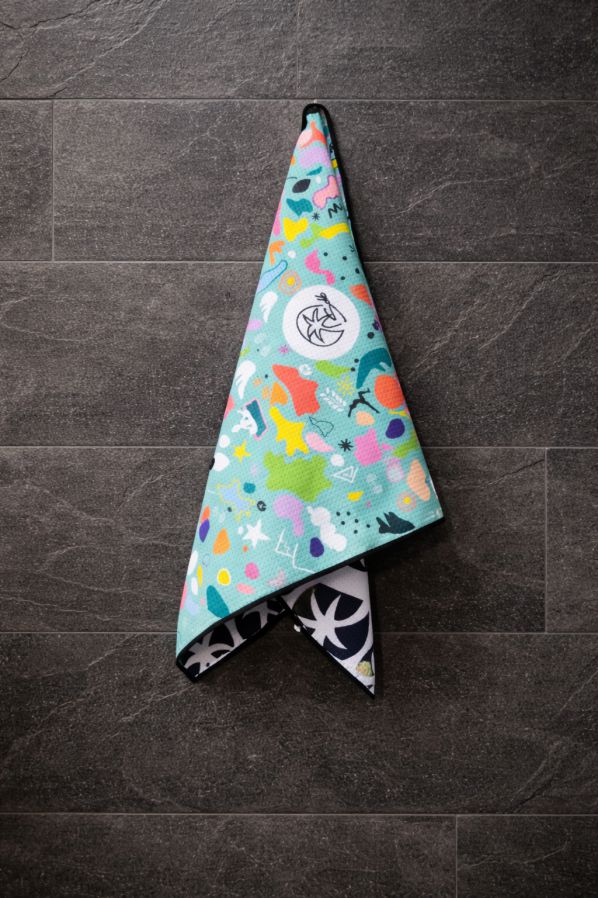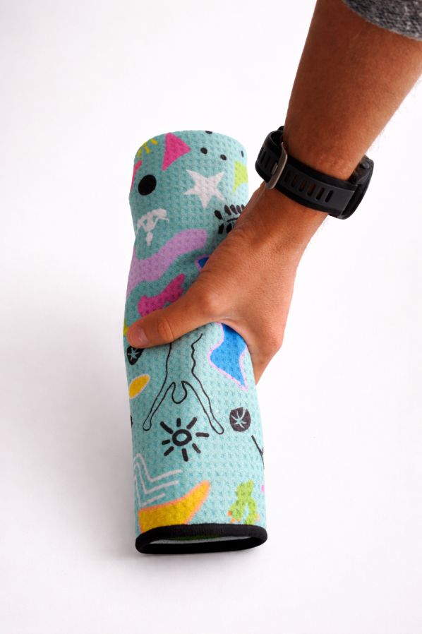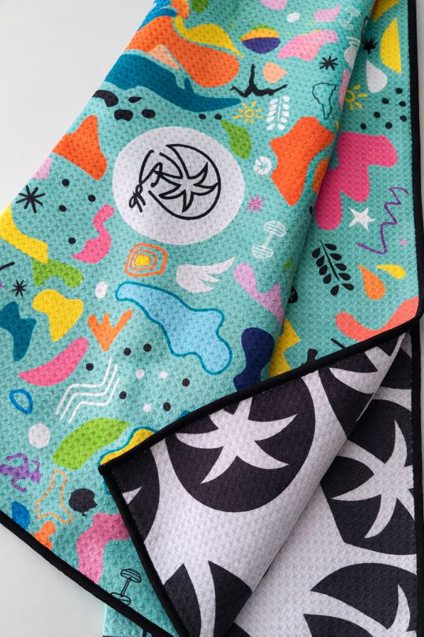 Toalla deportiva de doble cara con diseño exclusivo “Equilibrio”, un estampado lleno de movimiento que integra deporte, naturaleza y bienestar en una misma composición.